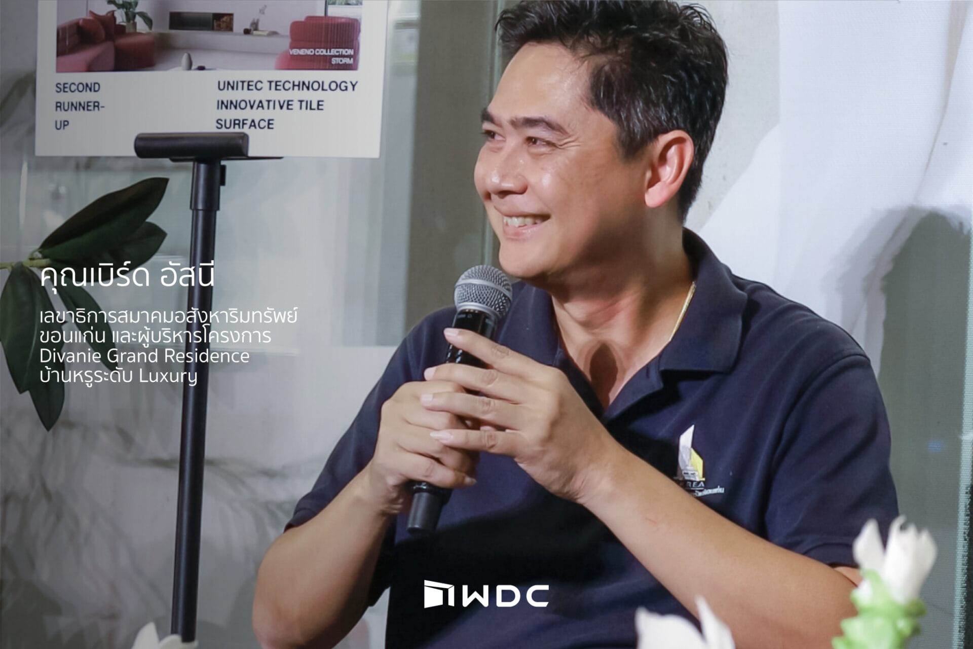 WDC Open House Khon Kaen เปิดโชว์รูมโฉมใหม่ จัดงานเสวนาครั้งสำคัญของภาคอีสาน ครั้งแรกที่สองคีย์แมนแห่งวงการมาพบกันบนเวทีเดียว!! โดยคุณหนึ่ง นครา ประธานกรรมาธิการใหญ่สถาปนิกอีสาน และผู้ก่อตั้ง Nakara Architects จับคู่เสวนากับ คุณเบิร์ด อัสนี เลขาธิการสมาคมอสังหาริมทรัพย์ขอนแก่น และผู้บริหารโครงการ Divanie Grand Residence บ้านหรูระดับ Luxury ที่มาร่วมถอดรหัสแนวคิด “การพัฒนา สู่แรงบันดาลใจแห่งการออกแบบ” ที่เปิดโลกทัศน์ใหม่ให้กับสถาปนิก ดีไซเนอร์ และเจ้าของโครงการในภาคอีสาน เห็นถึงพลังของวัสดุตกแต่งที่ไม่ใช่แค่ความสวยงาม แต่ยังตอบโจทย์การใช้งานจริง
