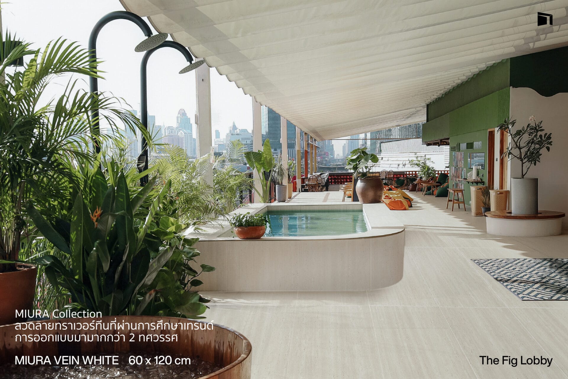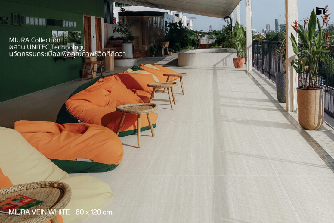 WDC มีส่วนร่วมในการถ่ายทอดตัวตนของโครงการผ่านกระเบื้อง MIURA collection แรงบันดาลใจจากลวดลาย Travertine Vein Cut โทนสีขาว และถูกยกระดับด้วยเทคนิคการจำลองการปิดรูพรุนเฉพาะของ WDC ช่วยรักษาผิวสัมผัสให้สมจริง สวยงามแบบหินธรรมชาติ พร้อมรองรับการใช้งานจริงทั้งบนพื้นและผนัง ดูแลรักษาง่ายไม่เก็บฝุ่นและคราบสกปรก