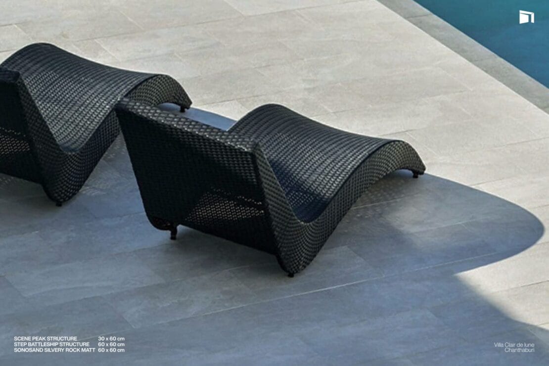 Sonosand Silvery Rock Matt 60×60 cm : ลวดลายที่ได้แรงบันดาลใจจากกระแสลม และกระแสน้ำที่พัดบนผืนทรายจนเป็นลวดลายอันมีเอกลักษณ์ ช่วยสร้างบรรยากาศที่ผ่อนคลายทุกช่วงเวลา